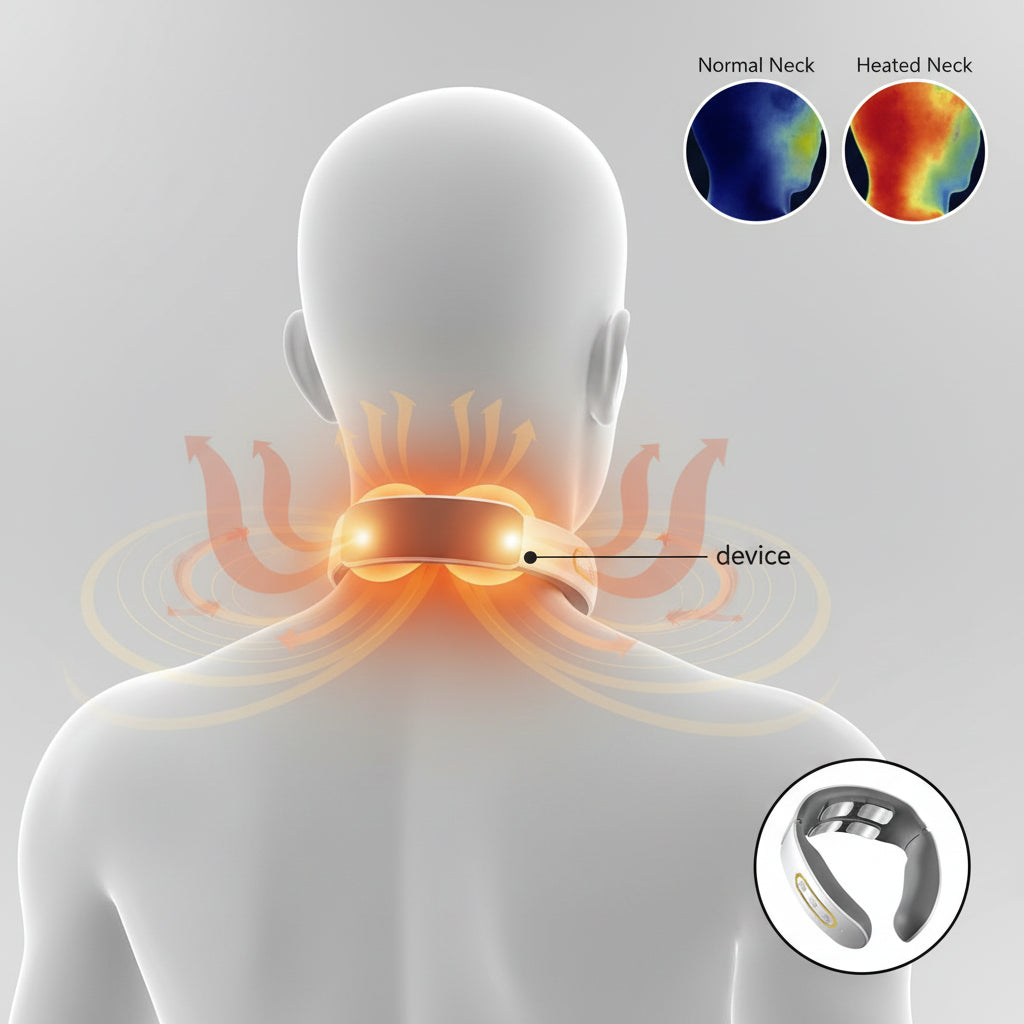Imagine your neck muscles gradually relaxing as soothing heat and gentle pulses penetrate deep into the tissue. Like a warm hand wrapping around you, tension melts away and a sense of lightness replaces pressure. Your mind begins to calm.